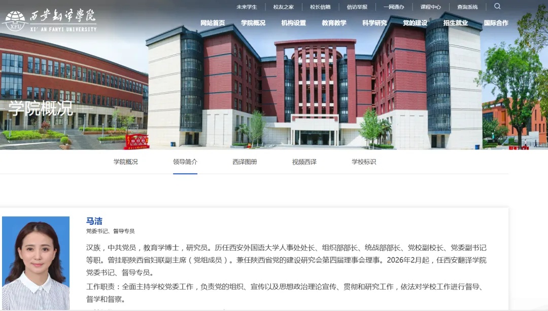 据西安翻译学院官网“领导简介”一栏更新显示,马洁已任西安翻译学院党委书记、督导专员。