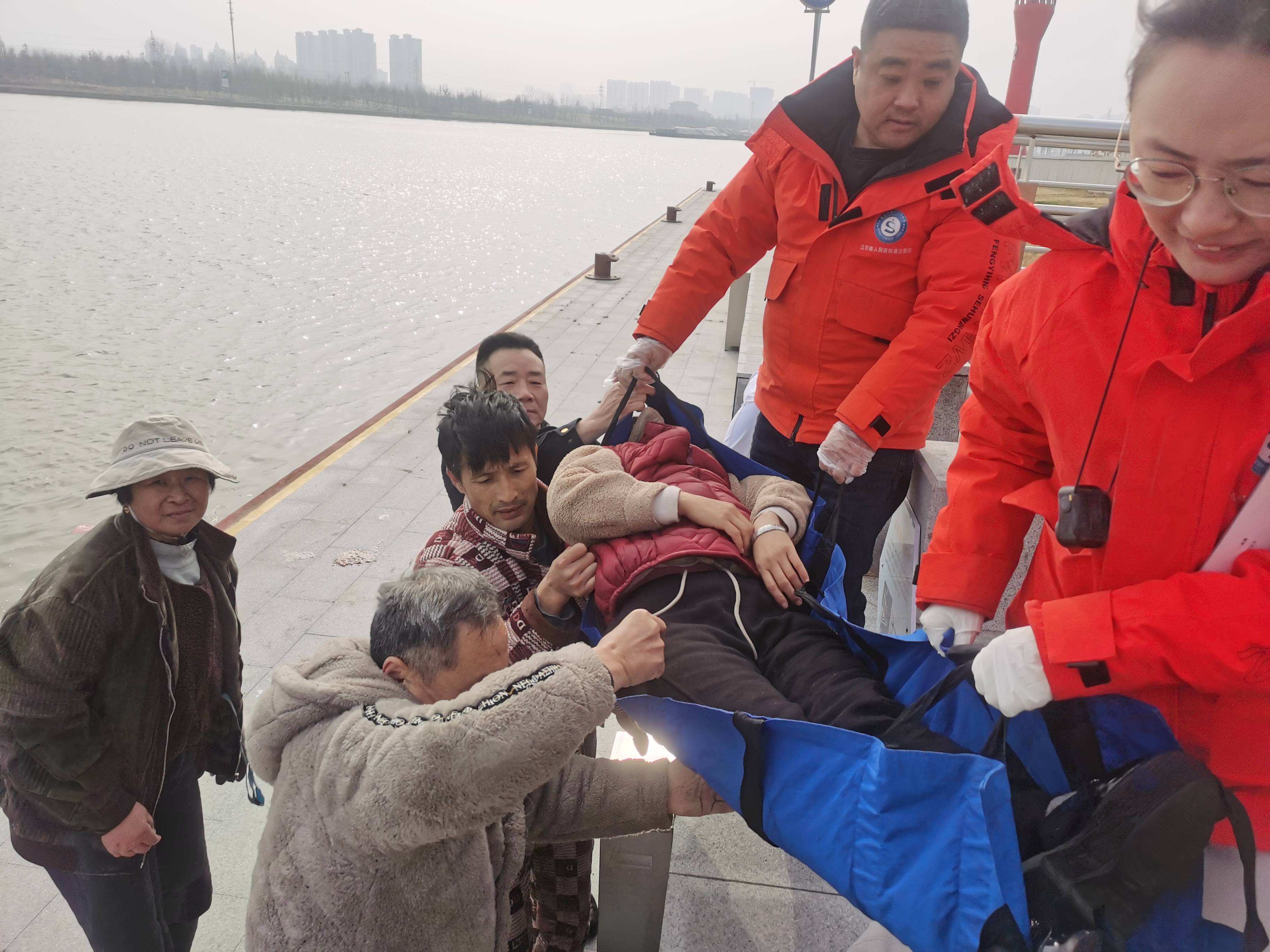 在了解情况后,值班人员立即启动应急预案,迅速拨打120急救电话,根据求助船员描述,向医护人员准确传达伤者状况。随后,在求助船员引导下,工作人员来到大队码头,只见小船正处于距岸约20米的河心,一名船员仰躺在甲板上,工作人员立即隔空喊话,引导小划船平稳靠岸。靠岸后发现受伤船员面色苍白,表情痛苦,嘴角留有血迹,工作人员一边半跪在船舷边耐心安抚:“师傅,放松呼吸,医生马上就到!”