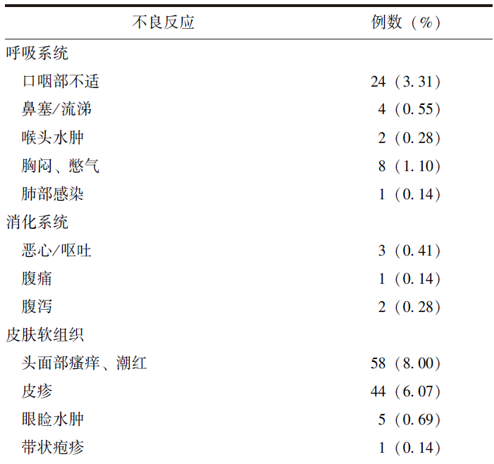 725例患者中,571例对利妥昔单抗注射液耐受良好,给药过程顺利,未发生药物相关不良反应;154例发生了≥1种药物相关不良反应,总体不良反应发生率为21.24%。不良反应涉及呼吸系统、消化系统、皮肤软组织、神经系统、心血管系统、血液循环系统等,常见不良反应(发生率为1%~10%)有头面部潮红伴瘙痒(8.00%)、皮疹(6.07%)、口咽部不适(3.31%)、发热(1.38%)和胸闷、憋气(1.10%),见表3。多数为输液过程中发生的一过性不良反应,暂停给药并给予苯海拉明后可消退,后续减慢滴速可重新给药。