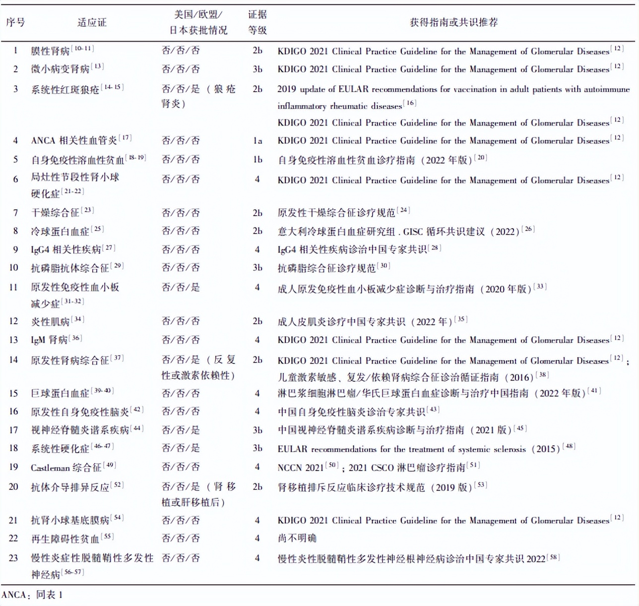 膜性肾病、系统性红斑狼疮、ANCA相关性血管炎、自身免疫性溶血性贫血等多个超说明书适应证均有随机对照试验的支持,并获得国内外权威指南的推荐;冷球蛋白血症、炎性肌病及IgG4相关性疾病等适应证尚缺乏随机对照试验证据,但获得专家共识等临床经验性证据的推荐;原发性免疫性血小板减少症、视神经脊髓炎谱系疾病、系统性硬化症等适应证获日本医疗器械管理局的批准;而利妥昔单抗治疗难治继发性再生障碍性贫血仅具有病例报告,证据等级较低且缺乏权威指南推荐,属于特殊病例探索性治疗。