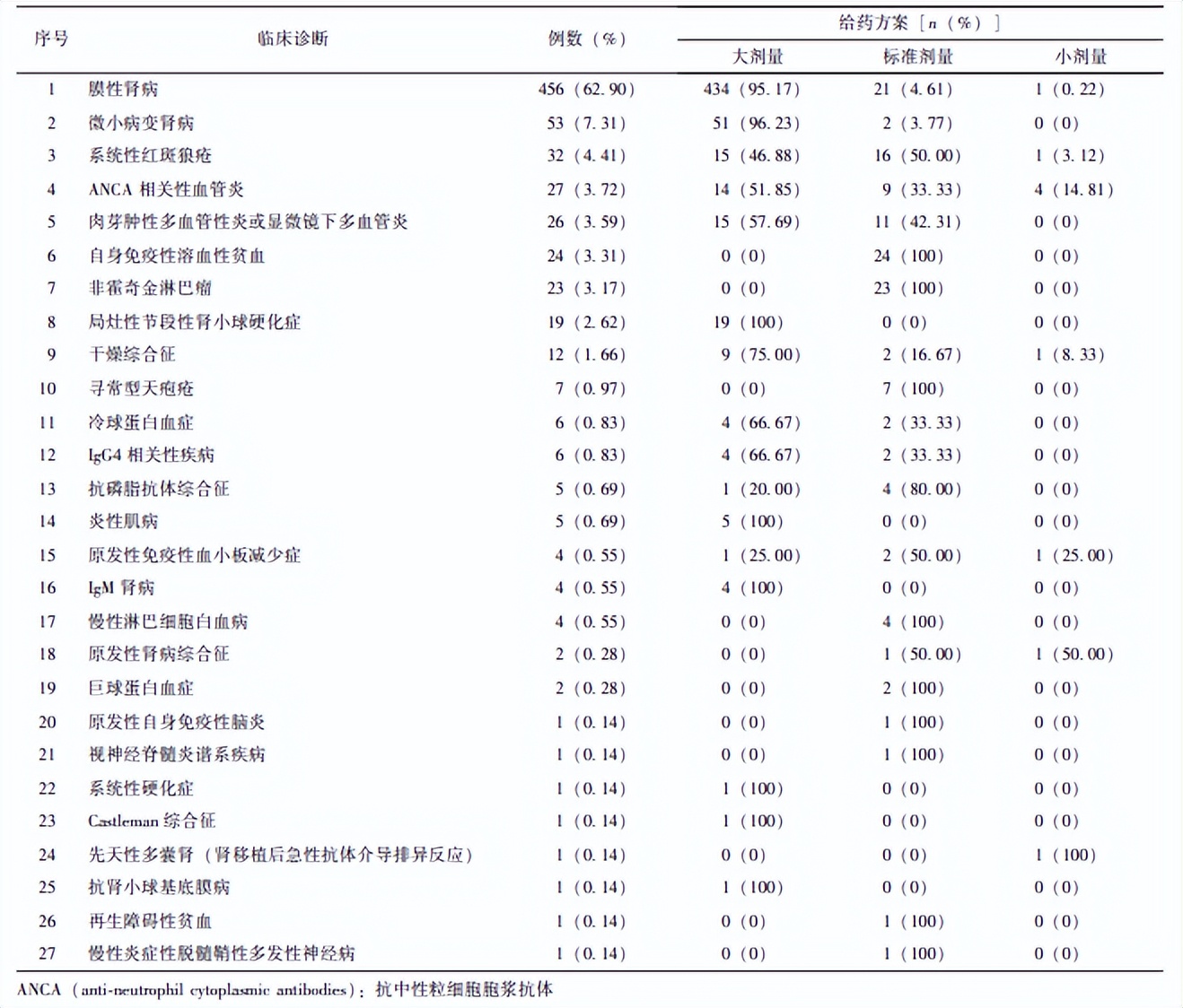 血液系统疾病如NHL、CLL、巨球蛋白血症、自身免疫性溶血性贫血等多采用标准剂量方案,寻常型天疱疮亦采用标准剂量方案治疗;免疫系统疾病如膜性肾病、ANCA相关性血管炎、干燥综合征等多采用大剂量方案治疗;采用小剂量方案的患者相对较少,多为儿科或疾病风险低的患者。