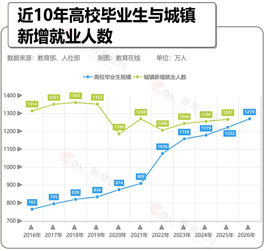 2025年,高校毕业人数1222万人,城镇新增就业人数1267万人,大学毕业生占到城镇新增劳动力的96%左右,几乎接近城镇新增就业数。
