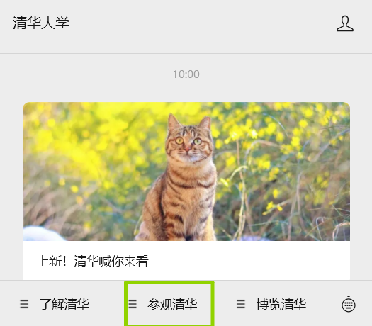 ①“清华大学”微信公众号“参观清华”菜单选择“预约参观”入口;