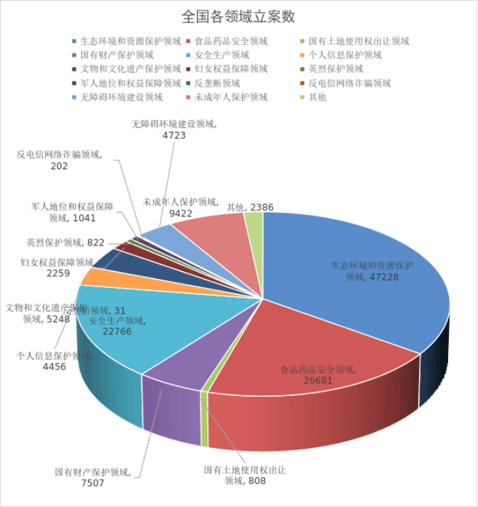从办案领域来看,共办理14个法定领域公益诉讼案件133194件,占办案总数的98.2%。在整体办案数量下降的情况下,食品药品安全、文物和文化遗产保护、妇女权益保障、反垄断、国有土地使用权出让、英烈保护等6个领域办案数量上升,分别立案26681件、5248件、2259件、31件、808件、822件,同比分别上升4.3%、34.2%、40.4%、93.8%、9.5%、1.6%。各法定领域呈现全面协调发展的良好态势。生态环境和资源保护领域立案47228件,占全部立案总数的34.8%,稳定在30%以上。其他7个领域案件数量总体平稳,国有财产保护领域7507件,未成年人保护领域9422件,安全生产领域22766件,个人信息保护领域4456件,无障碍环境建设领域4723件,军人地位和权益保障领域1041件,反电信网络诈骗领域202件。此外,审慎稳妥探索反不正当竞争、劳动者权益保障等新领域办案,共办案2386件。