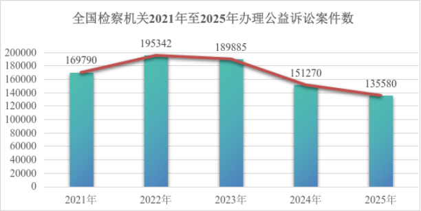 2025年,全国检察机关坚持质效优先导向,更加注重“有质量的数量”,办案规模在优化调整中趋向稳健,保持在合理区间。共立案135580件,同比下降10.4%。其中,行政公益诉讼立案124033件;民事公益诉讼立案11547件。同时,省级检察院带头办案力度加大,省级检察院办理81件,同比上升39.7%;市级检察院办理2697件,同比上升1.7%。