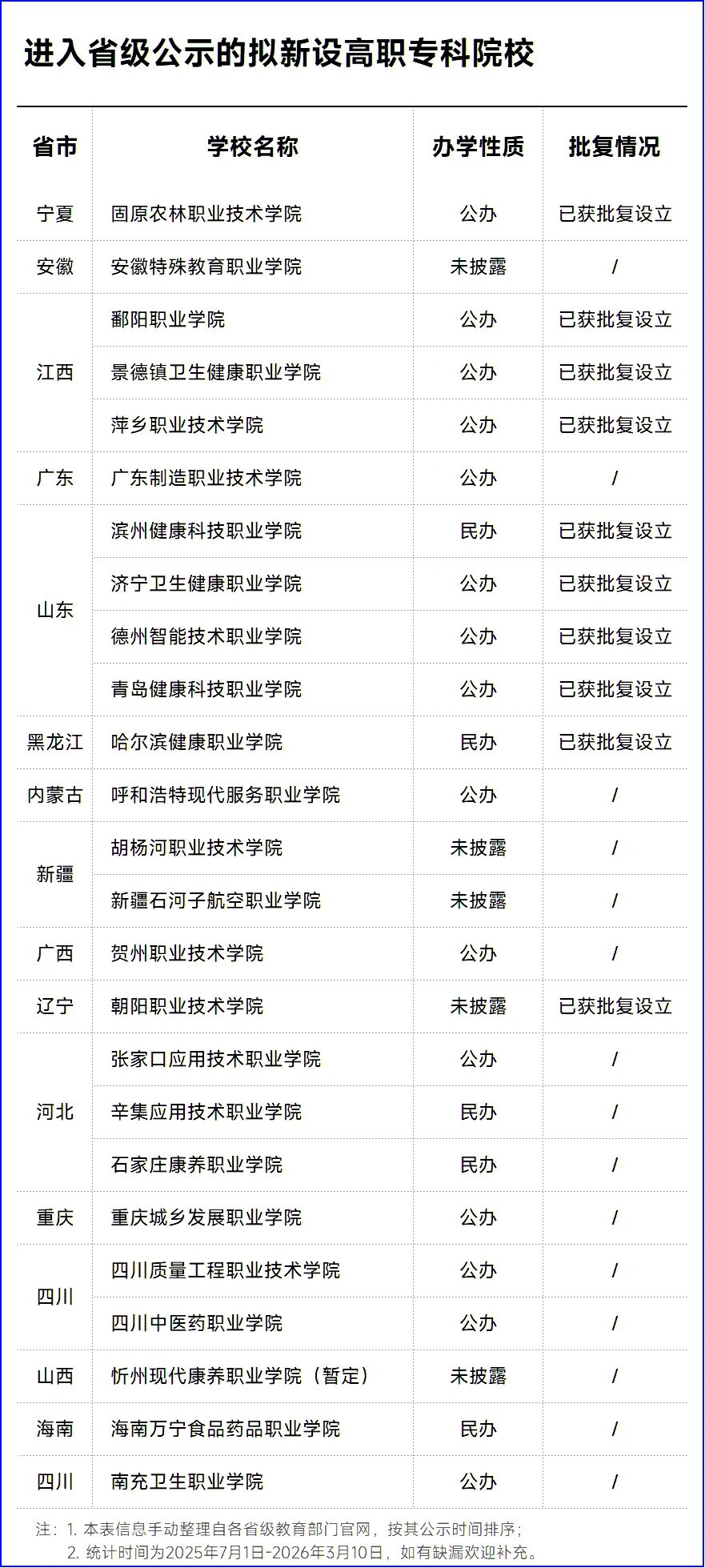 截至发文,据不完全统计,2025年7月以来共25所拟新设专科层次高职院校进入省级教育部门公示,其中已有10所获得省级人民政府批复设立。
