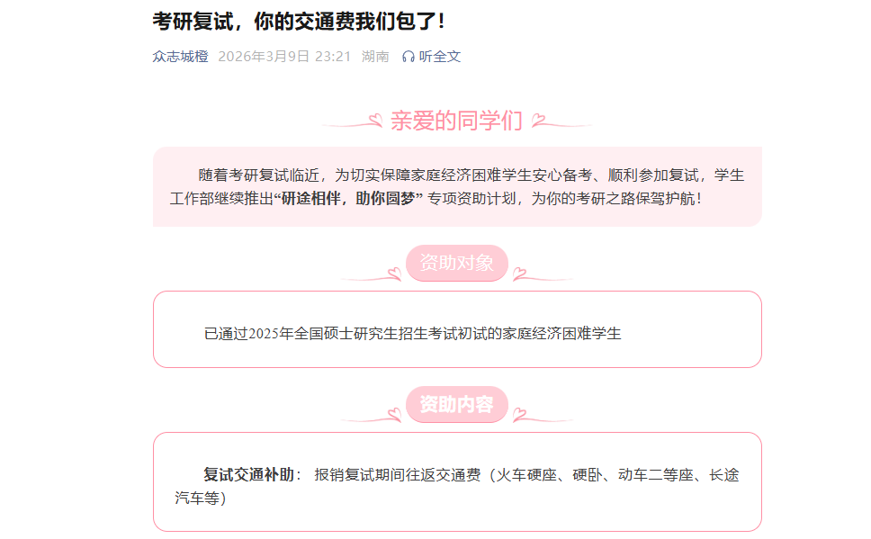 太暖心!湖南这所高校“承包”困难学子考研复试路费