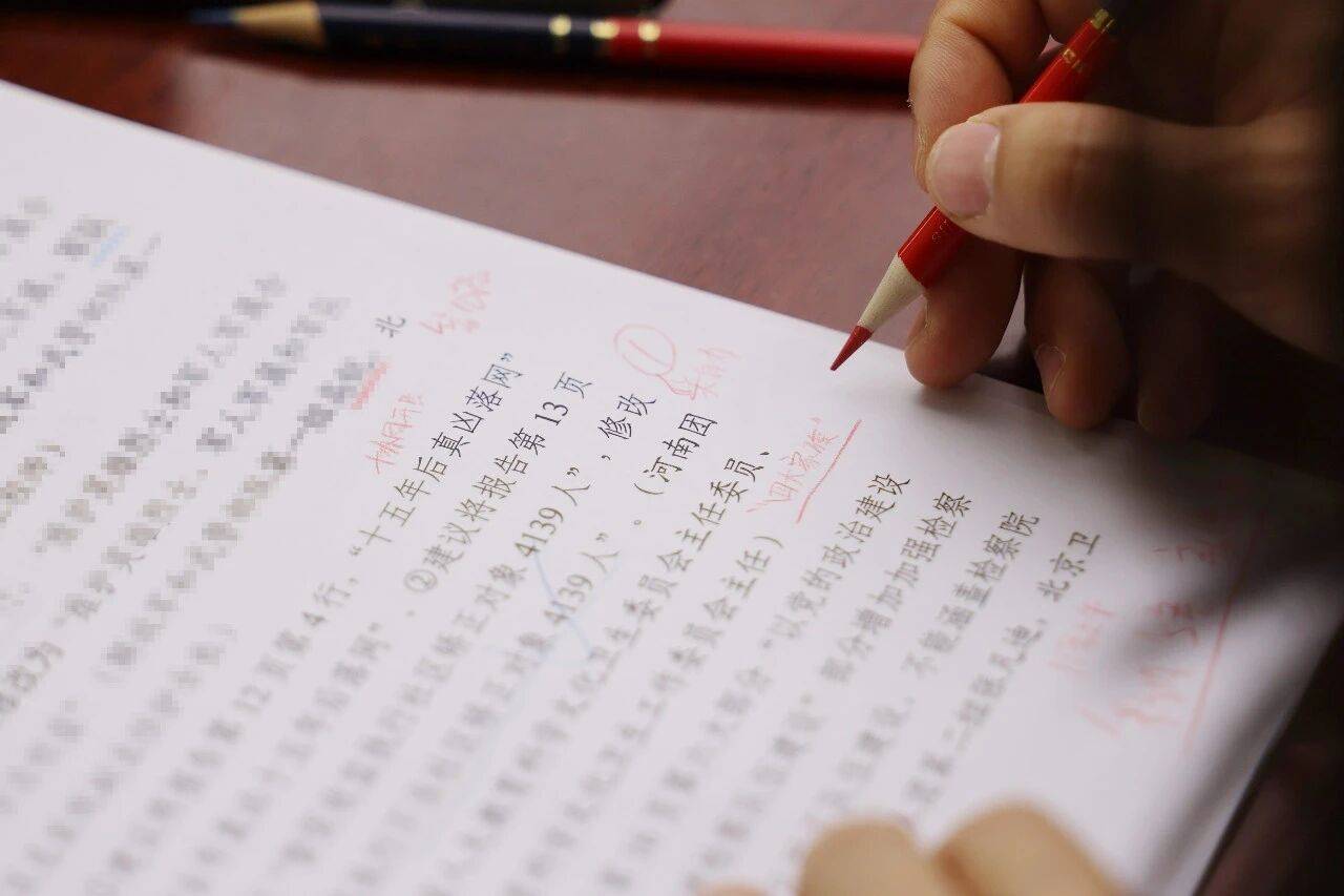 3月11日晚7时,最高检工作报告起草组相关同志带着修改后的报告来到印刷厂,分组逐字逐句在做印刷前的最后校对工作。