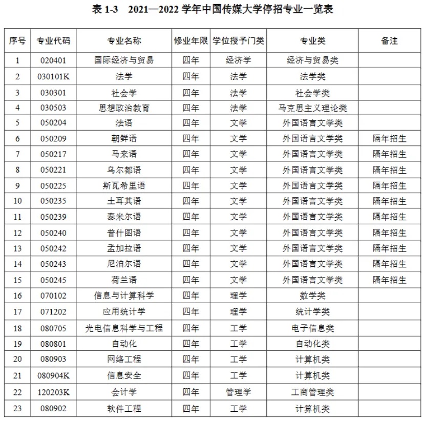 中国传媒大学2021-2022学年停招专业一览表(来源:《中国传媒大学2021—2022学年本科教学质量报告》)