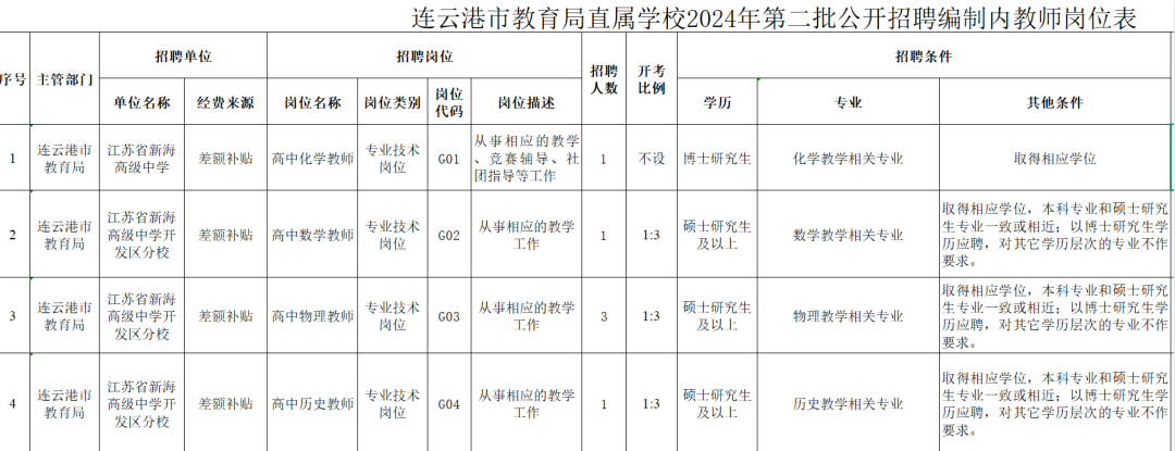 连云港市2024年直属学校招聘中,高中岗位明确将硕士研究生作为核心招聘对象,个别优质岗位甚至要求博士学位,本科生几乎无竞争优势。
