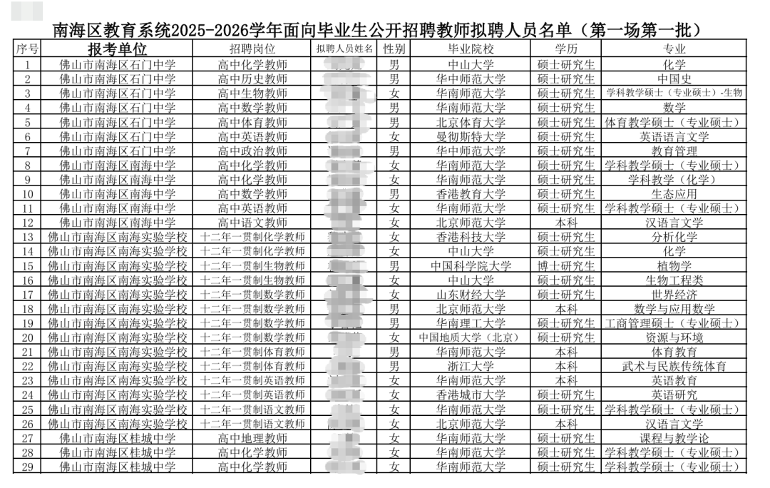 据佛山市南海区教育局公布的2025-2026学年教师招聘数据显示,中学阶段教师中,研究生学历占比远高于本科学历,且录用者几乎清一色是部属师范院校或头部高校毕业生;即便是镇级小学教师,研究生学历占比也与本科学历基本持平,其中不乏知名院校和头部高校的毕业生。