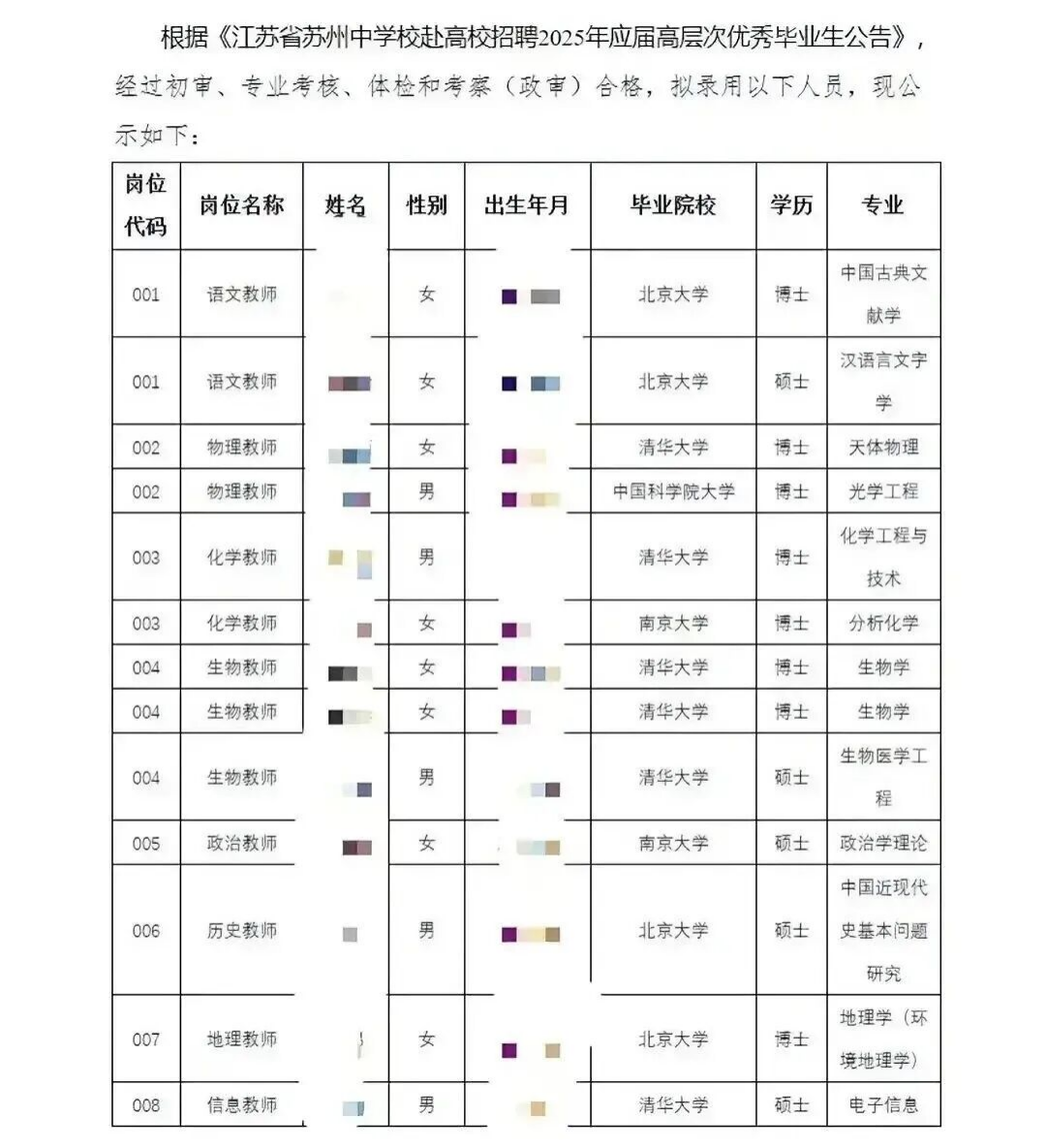 2025年上半年,苏州中学新招聘的13名高层次教师中,6位是清华北大博士,4位是清华北大硕士,另有1位中国科学院大学博士、1位南京大学博士、1位南京大学硕士,全员均为985名校硕博,学历门槛直接拉满。