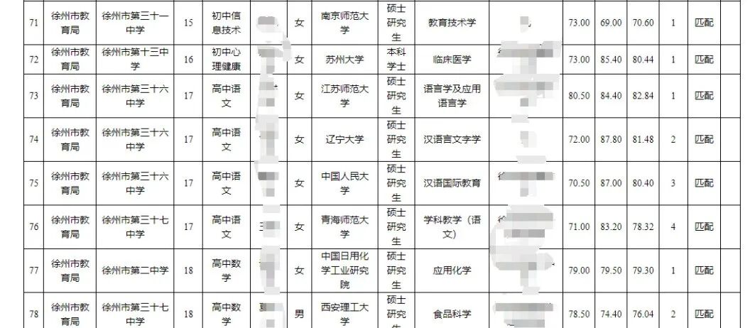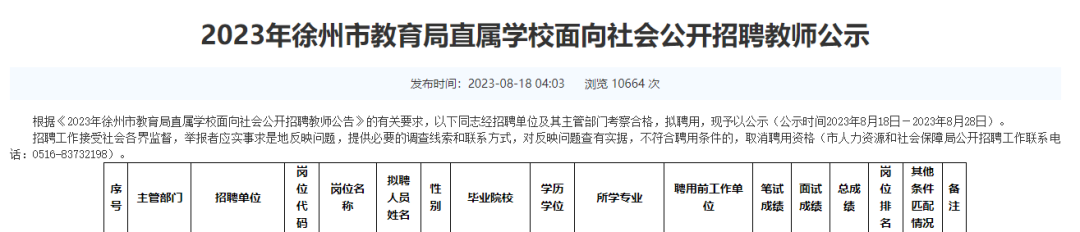 再看徐州市教育局直属学校2023年面向社会公开招聘的教师名单,拟录用人员几乎清一色为硕士研究生,其中不乏中国人民大学、武汉大学、苏州大学等985、211高校的研究生,学历门槛可见一斑。