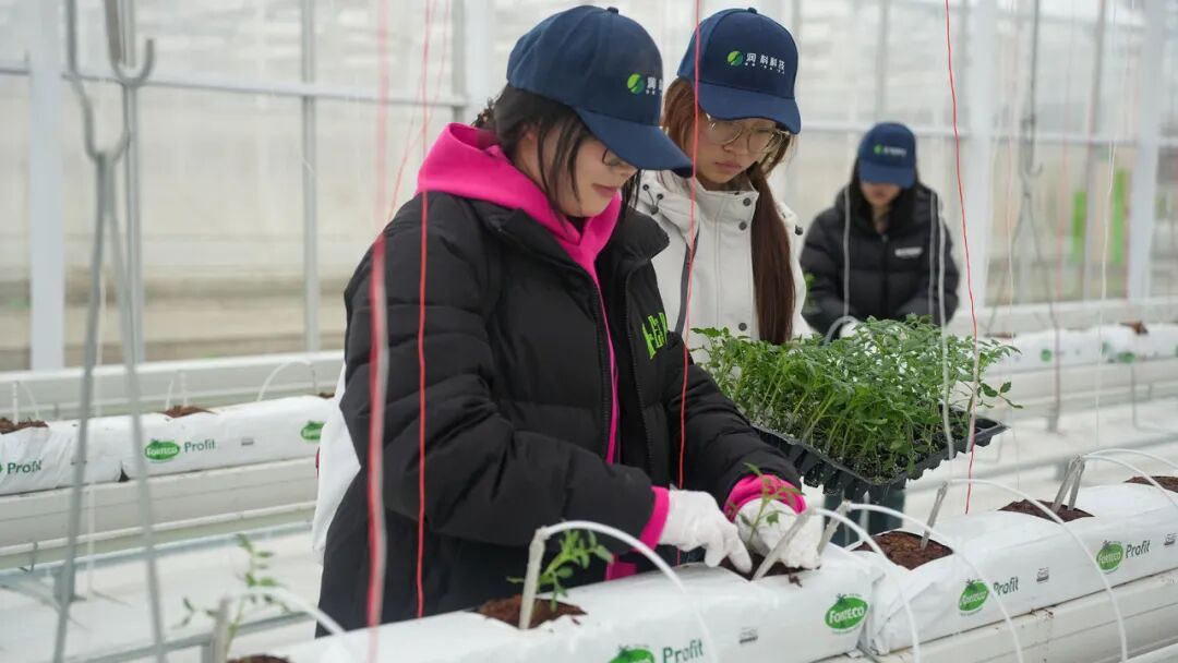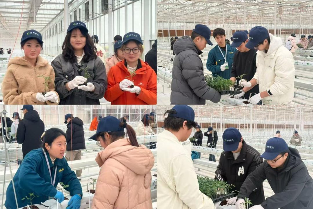 抵达产业学院后,润科农业相关负责人对学院师生的到来表示热烈欢迎。他简要介绍了公司的产业布局,并表示作为产业学院,非常欢迎同学们来基地实践,希望大家在亲手操作中感受现代农业的科技魅力。在大棚里,学生们被分为五个小组,分别由五名经验丰富的润科农业技术员担任实践导师,带领大家了解现代化的连栋温室大棚种植技术。技术员向同学们介绍了大棚内的科技设备,随后开始现场示范番茄苗的定植操作。进入动手实践环节,大家2-3人一组、分工协作,小心翼翼地拿起番茄苗,按照技术员示范的步骤,对番茄苗进行定植,在整齐排列的种植槽和刚刚铺设好的椰糠基质植袋上挖孔、放苗、培基质、浇水,种下一株株幼苗。