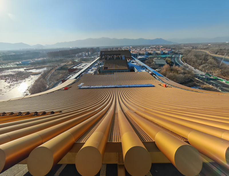 为重现故宫三大殿“金顶”金碧辉煌、巍峨庄严的华贵神韵,项目团队并未简单复刻传统琉璃瓦工艺,而是创新采用先进金属屋面系统。依托精密的直立锁边技术与定制化构件,在延续传统屋顶层叠韵律的庄严造型之余,将防水、通风、检修等现代建筑功能巧妙整合,兼顾形制之美与实用之能。为匹配琉璃瓦独有的温润质感,团队历经多轮实物比选与数字模拟,反复调试屋面色彩与光泽,最终让金属屋面在自然光线下呈现出媲美传统琉璃的视觉效果,达成建筑形韵与现代机能的和谐统一。