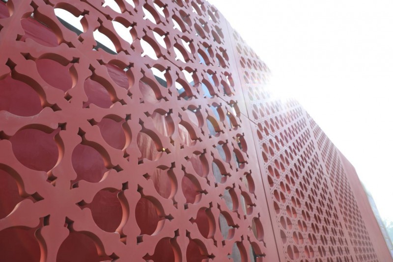 在再现并永久保持故宫经典红墙这一行业难题上,项目团队开创性选用超高性能混凝土(UHPC)作为基材,自主研发“内掺着色”核心工艺。耗时六个月开展上百组配比实验,精准把控氧化铁红等矿物颜料与UHPC的融合度,将故宫红深植材料内部,让色彩成为墙体自身的固有属性,从根源上杜绝褪色、脱落的风险。为确保墙体极致平整度与毫米级施工精度,团队摒弃行业常见的喷射工艺,前瞻性采用高精度“现浇”成型工艺,依托定制钢模、精密振捣及不锈钢纤维增强体系,保障每块幕墙板内外质地均匀、尺寸精准无误。经专业检测,这批特制的“故宫红”UHPC幕墙板抗压强度超120MPa,在完美复现故宫经典红色的同时,赋予墙体卓越的耐久性、强度与韧性,为还原故宫建筑的庄重形制筑牢坚实技术根基。