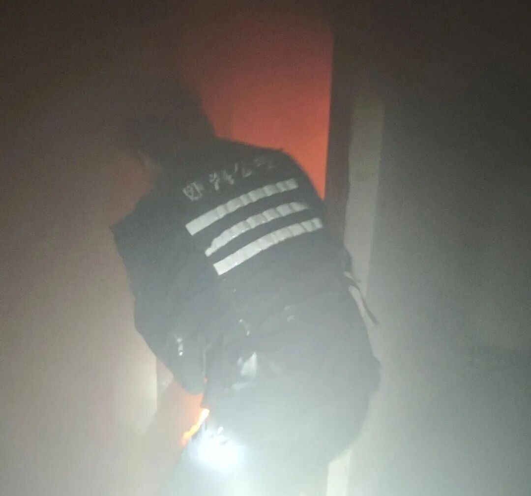 因担心起火房间内有人员被困,金振鑫从楼道取来常备灭火器,来不及返回单位准备防护装备,便顶着灼人的热浪、呛鼻的浓烟一头冲进火场。