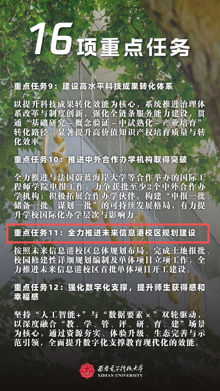 2026年3月1日,西安电子科技大学举行七届三次教职工代表大会、工会会员代表大会暨2026年度学校工作会议。会上提到,学校拓展办学空间布局,谋划建设未来信息港校区。2026年,西电要在5个方面干20件事,落实16项重点任务,而“全力推进未来信息港校区规划建设”正是重点任务之一。