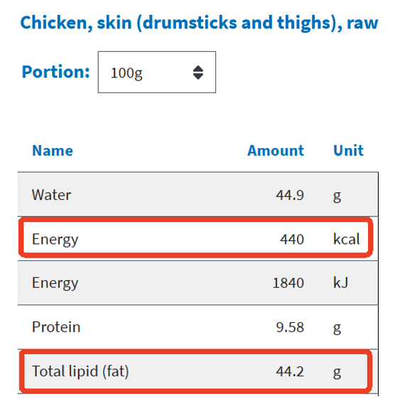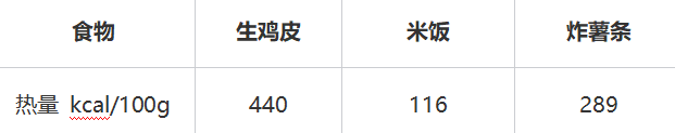 可以看到,即便是炸薯条这种在大众认知中“油多、热量高”的食物,每 100 克的热量也明显低于鸡皮。换句话说,同样是 100 克,鸡皮所提供的能量,比炸薯条还要高出约一半。