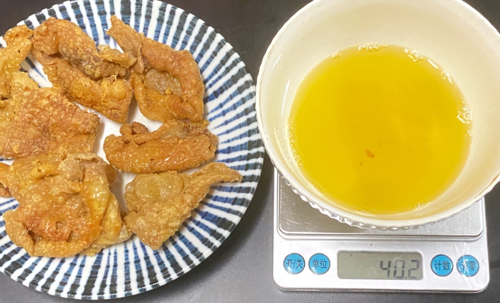 这些就是从鸡皮里被逼出来的自身脂肪,这些被“炸”出来的油,直观地告诉你鸡皮到底有多“肥”。
