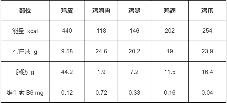 维生素 B6 是鸡肉的突出成分,其含量比其他食物更高。而每 100g 鸡皮中,维生素 B6 只有 0.12mg,仅为鸡胸肉的 1/6。