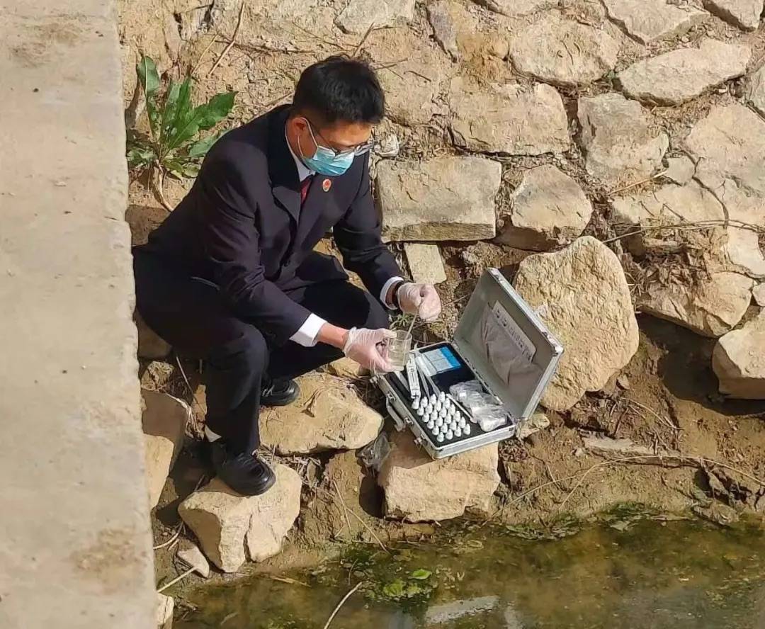 河北省秦皇岛市北戴河新区检察院干警利用快速检测设备对官道沟河道水质进行检测。