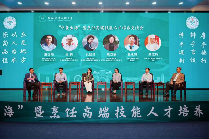 在圆桌交流环节,世界华人粤菜烹饪联合会会长关志辉、广州华商职业学院副校长赵永锋、四川旅游学院烹饪与食品科学工程学院院长熊双丽、福建商学院旅游与休闲管理学院副院长孔旭红、扬州大学中餐繁荣基地办公室主任吴鹏、顺德职业技术大学烹饪学院党总支书记董国顺围绕“‘中餐出海’现状与展望”主题进行了交流对话,分享实践经验与工作成效。