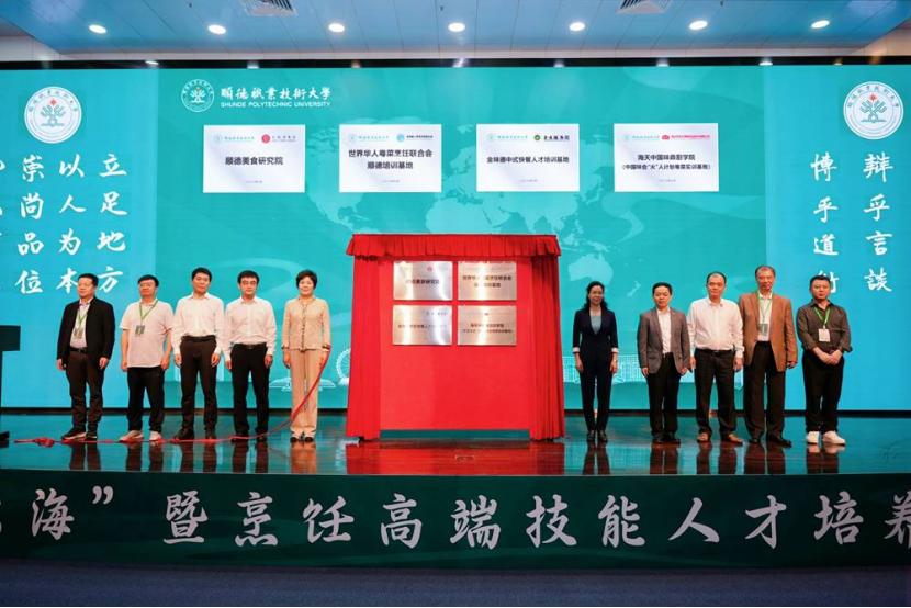 活动现场举行了行业企业与顺德职业技术大学共建的四家机构揭牌仪式。顺德美食研究院(东逸湾国际美食研究院)、世界华人粤菜烹饪联合会顺德培训基地、金味德中式快餐人才培训基地、海天中国味鼎厨学院(中国味合“火”人计划粤菜实训基地)在顺德职业技术大学揭牌成立。