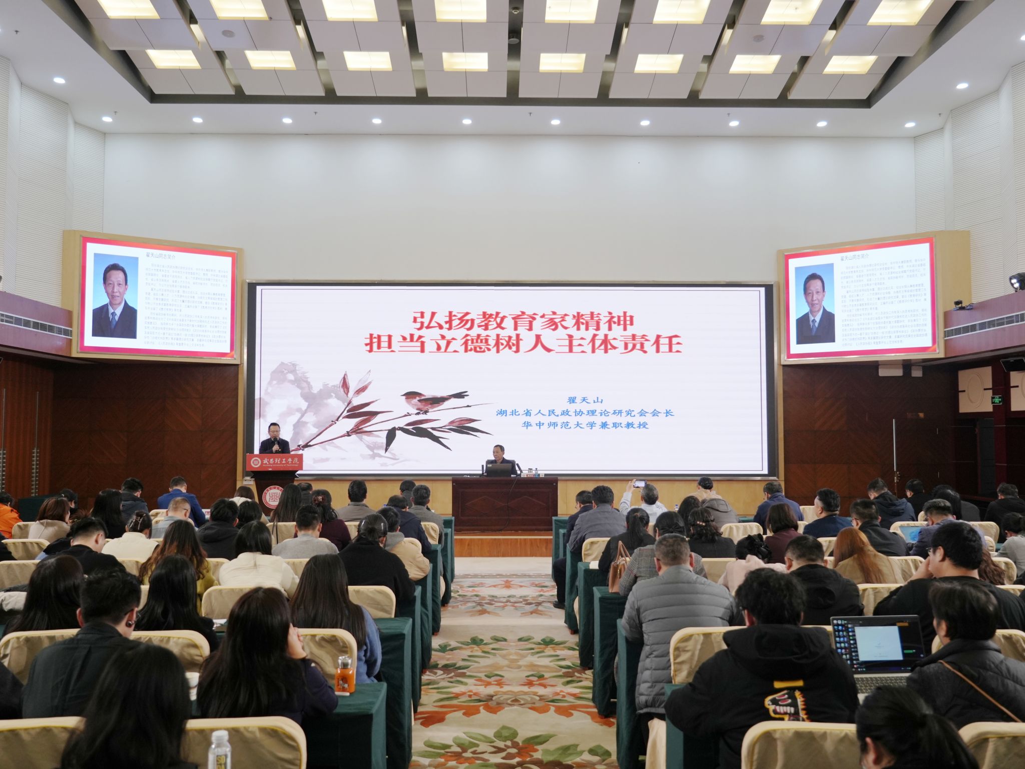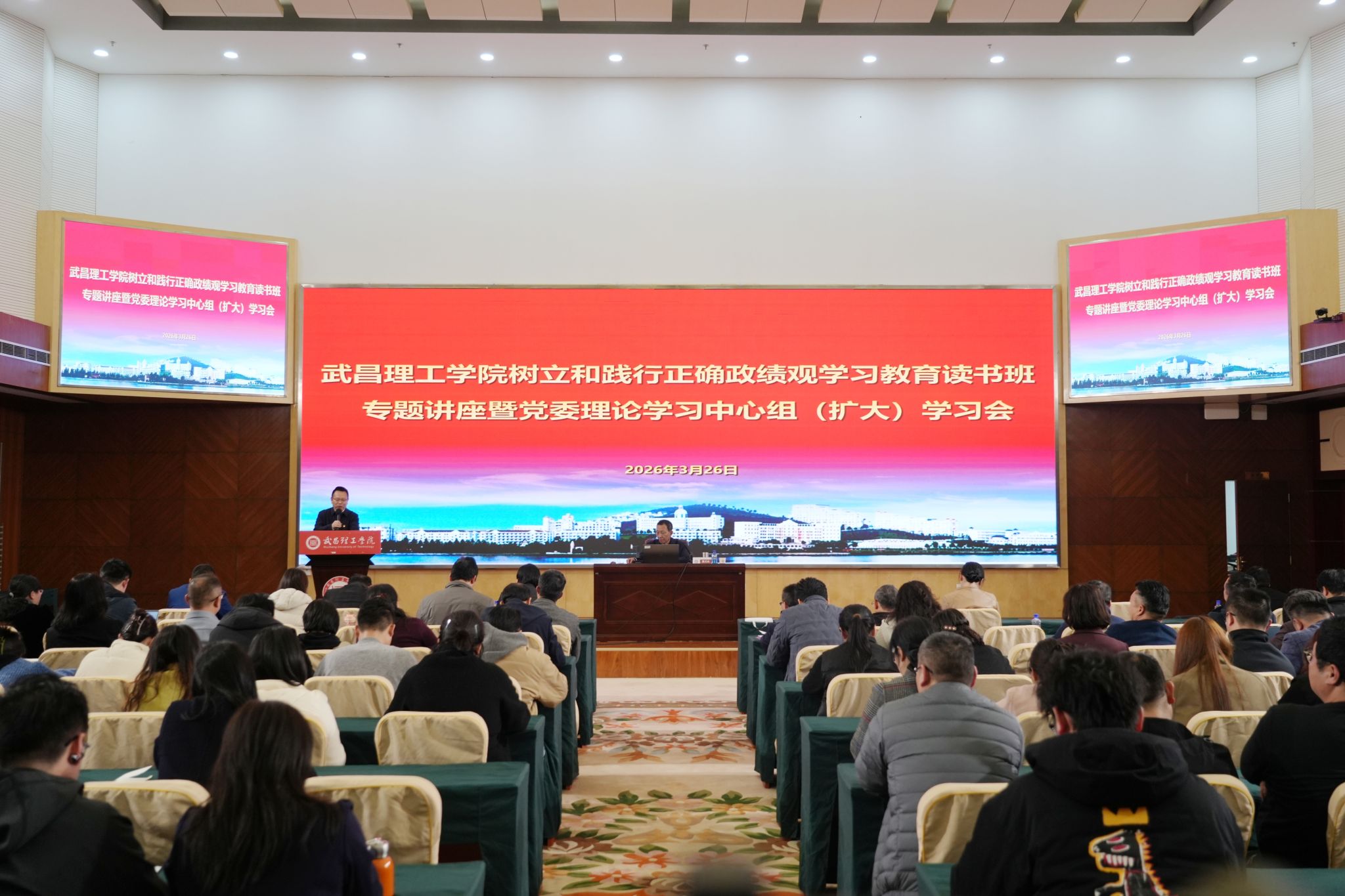 3月26日下午,武昌理工学院树立和践行正确政绩观学习教育读书班专题辅导报告暨党委理论学习中心组(扩大)学习会在图书馆六楼报告厅举行。湖北省政协常委、湖北省人民政协理论研究会会长翟天山教授应邀作题为《弘扬教育家精神 担当立德树人主体责任》的专题辅导报告,为全校党员干部、教师带来一场思想深邃、内涵丰富、兼具理论高度与实践价值的精神盛宴和教育党课。校党委书记高建勋教授主持报告会。全体在家校领导、校党委理论学习中心组成员、中层领导干部、各学院团委书记、党支部书记、教师及素质导师代表参会。