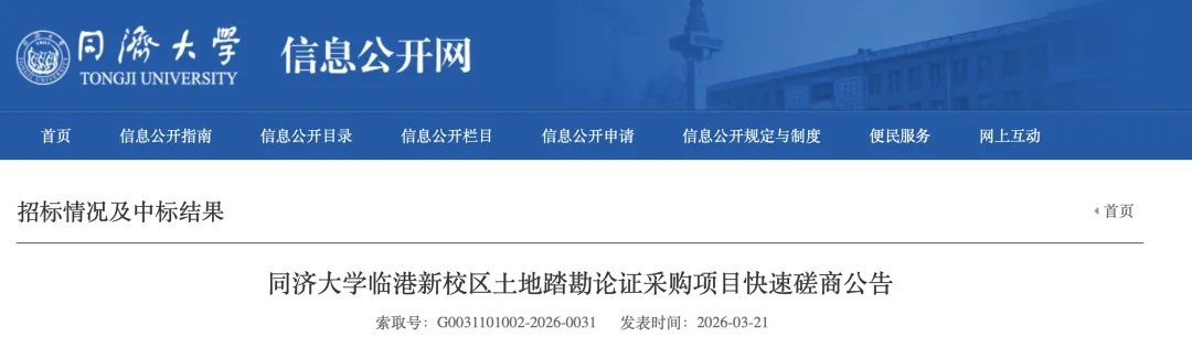 2026年3月21日,同济大学发布《同济大学临港新校区土地踏勘论证采购项目快速磋商公告》。公告显示,该项目位于上海市临港新片区综合产业片区ZH-04单元K20街坊同济大学临港新校区,项目根据项目背景和当地实际情况,进行项目建设的重要性分析;在资料梳理的基础上,梳理建设方案及建设用地情况;根据各层级的政策文件,制定节地评价技术路线;开展包括选址合理性、用地政策导向性、用地规模合理性等内容在内的建设项目及用地规划等相关数据分析等;提出论证结论。项目资金来源由学校自筹资金建设。项目已进入实质性推进阶段。