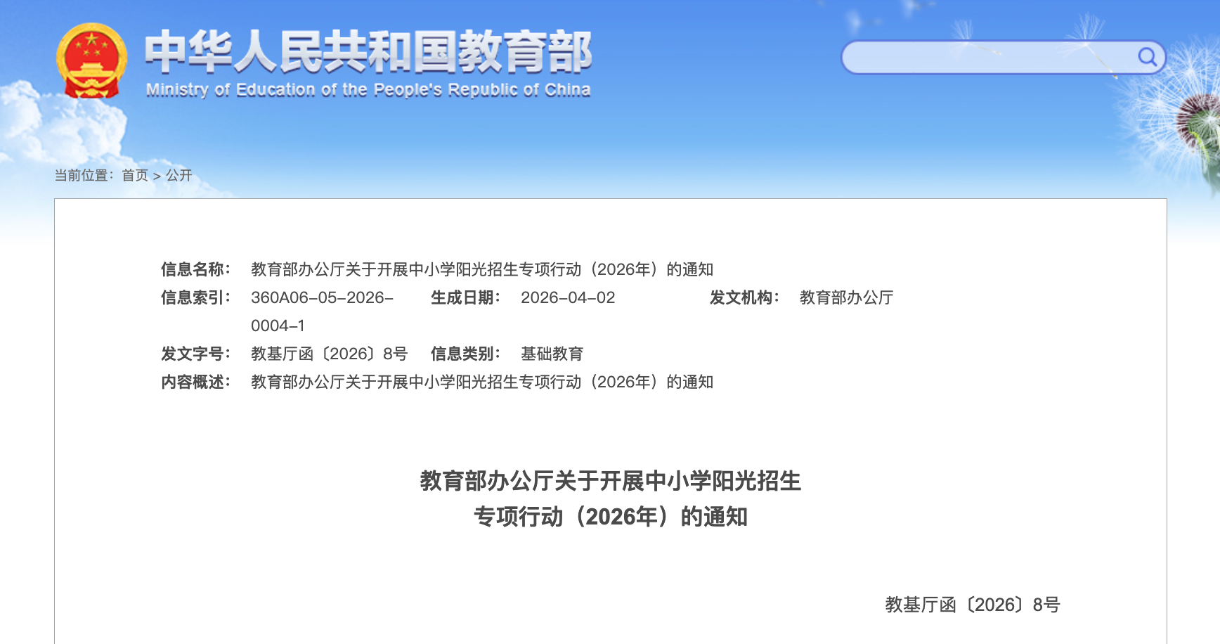 近日,教育部办公厅印发通知,对开展中小学阳光招生专项行动(2026年)作出部署。