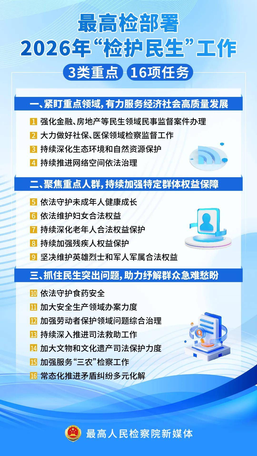 会议指出,2026年“检护民生”工作围绕三类重点开展,即紧盯重点领域,有力服务经济社会高质量发展;聚焦重点人群,持续加强特定群体权益保障;抓住民生突出问题,助力纾解群众急难愁盼。具体为16项重点任务,分别为:强化金融、房地产等民生领域民事监督案件办理;大力做好社保、医保领域检察监督工作;持续深化生态环境和自然资源保护;持续推进网络空间依法治理;依法守护未成年人健康成长;依法维护妇女合法权益;持续深化老年人合法权益保护;持续加强残疾人权益保护;坚决维护英雄烈士和军人军属合法权益;依法守护食药安全;加大安全生产领域办案力度;加强劳动者保护领域问题综合治理;持续深入推进司法救助工作;加大文物和文化遗产司法保护力度;加强服务“三农”检察工作;常态化推进矛盾纠纷多元化解。