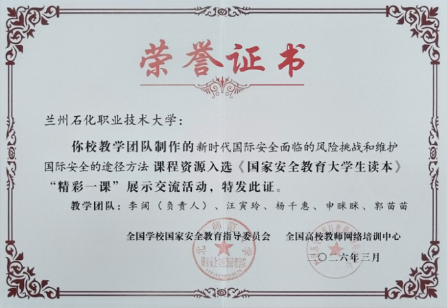 兰州石化职业技术大学入选的教学资源以“新时代国际安全面临的风险挑战和维护国际安全的途径方法”为主题,紧密结合大学生认知特点,运用案例教学、数字化互动等方式,生动阐释了总体国家安全观的科学内涵、核心要义与实践要求。该资源不仅教学设计逻辑清晰、内容翔实,更体现了理论性与实践性的统一,展现了较高的教学水准和创新意识。该资源已在全国高校教师网络培训中心上线,供全国高校教师学习使用。