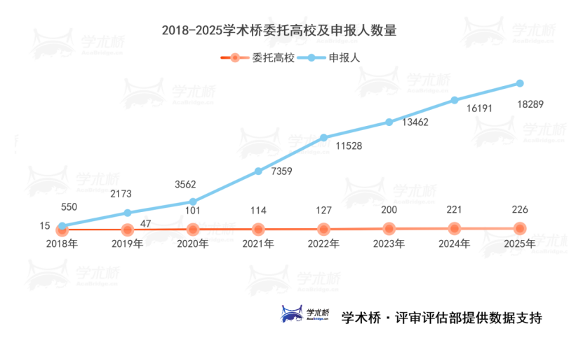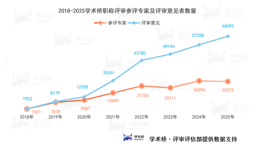 《报告》显示,第三方评价模式成为越来越多高校的选择。自2018年的15所起,委托学术桥进行各类评审的高校数量至2025年增长到226所,增长1407%。其中,“双一流”建设高校共67所,占委托高校总数的29.65%。申报人数量从2018年的550人增长至2025年的18289人,增长33.25倍。随着委托高校及申报人数量的激增,职称外审服务对参评专家的需求也同步大涨。2018-2025年,参评专家从1821位增长至25572位,增长13.04倍;评审意见表从1902份增长至64595份,增长32.96倍。