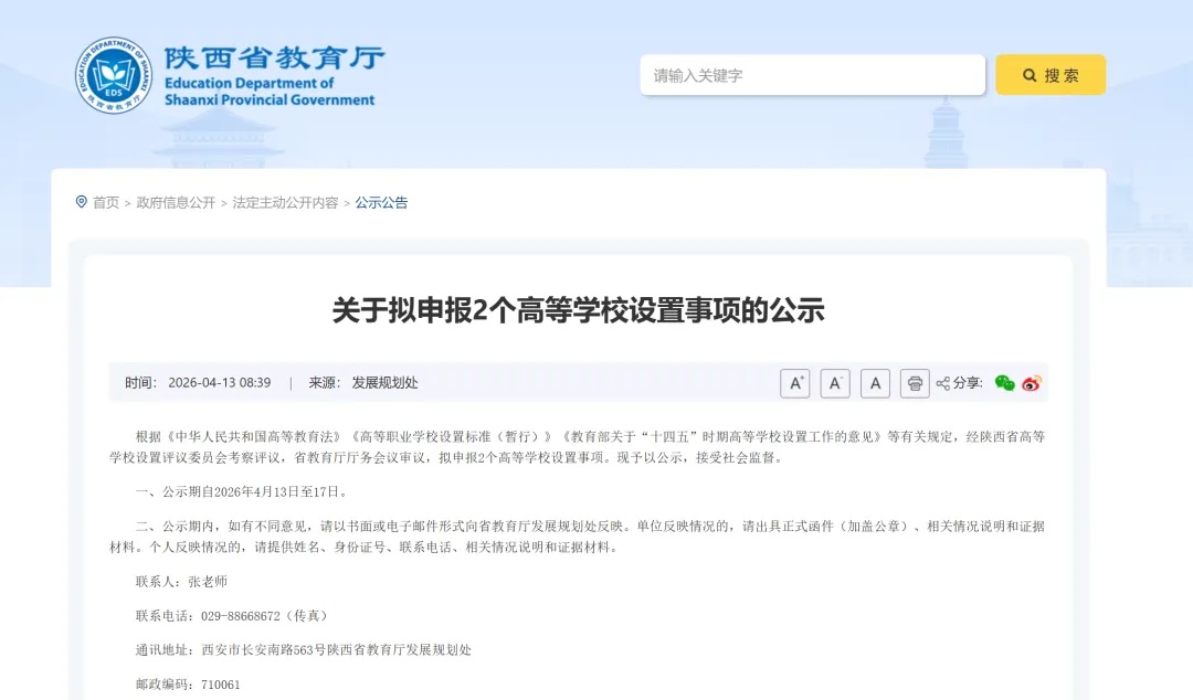4月13日,陕西省教育厅发布《关于拟申报2个高等学校设置事项的公示》,根据《中华人民共和国高等教育法》《高等职业学校设置标准(暂行)》《教育部关于“十四五”时期高等学校设置工作的意见》等有关规定,经陕西省高等学校设置评议委员会考察评议,省教育厅厅务会议审议,拟申报2个高等学校设置事项,现予以公示,接受社会监督。