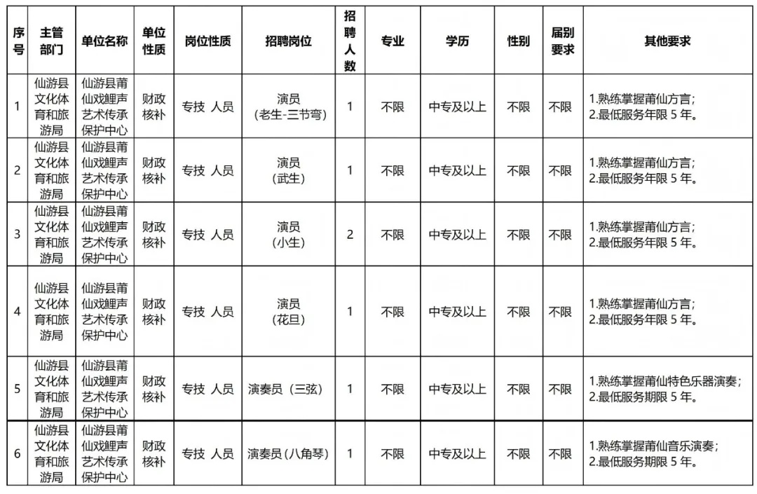 仙游县莆仙戏鲤声艺术传承保护中心是财政核补事业单位,主要从事莆仙戏创作、演出、对外交流的县级唯一的专业文艺院团。因工作需要,面向社会公开招聘专业技术人员7名,制定具体方案如下: