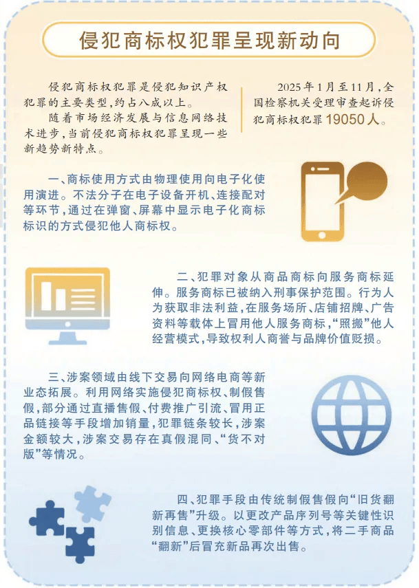 今年2月,最高检知识产权检察厅副厅长刘太宗做客“学思践悟党的二十届四中全会精神 持续推进习近平法治思想的检察实践”最高检厅长访谈时介绍,近年来,我国以商标为支撑的品牌经济开始崛起,市场主体对于服务商标的保护需求日益增长。检察机关陆续办理了不少侵犯服务商标犯罪案件,涉及教育培训、酒店住宿、家电维修、时装走秀、游乐场所等不同领域。这些案件中,行为人为获取非法利益,在服务场所、店铺招牌、广告资料等载体上冒用他人服务商标,“照搬”他人经营模式,导致权利人商誉与品牌价值贬损。