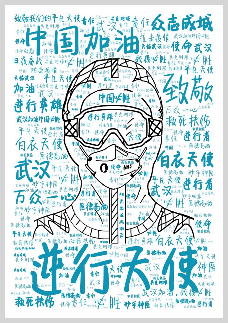 创意说明:被压出的痕迹是你们付出的印记,天使回家英雄凯旋,我们在北京等你!(作者:师维 )