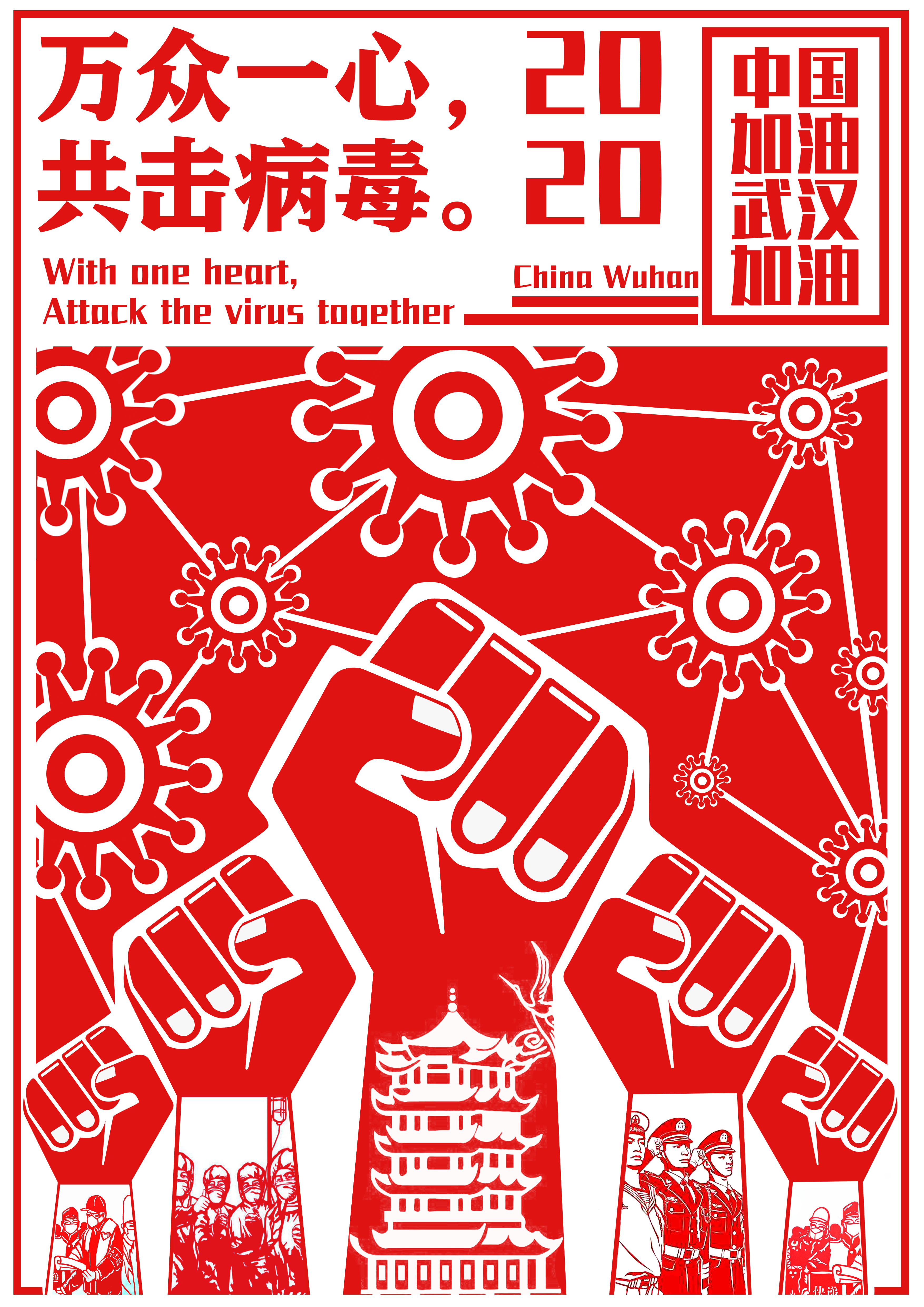 创意说明:灵感来源于中国剪纸艺术,画面由拳头和链接的病毒为基础图形,通过正负形演绎抗击疫情,色彩运用中国传统红色为主色调,希望疫情早日过去,带来祥和。(作者:马凯博 )