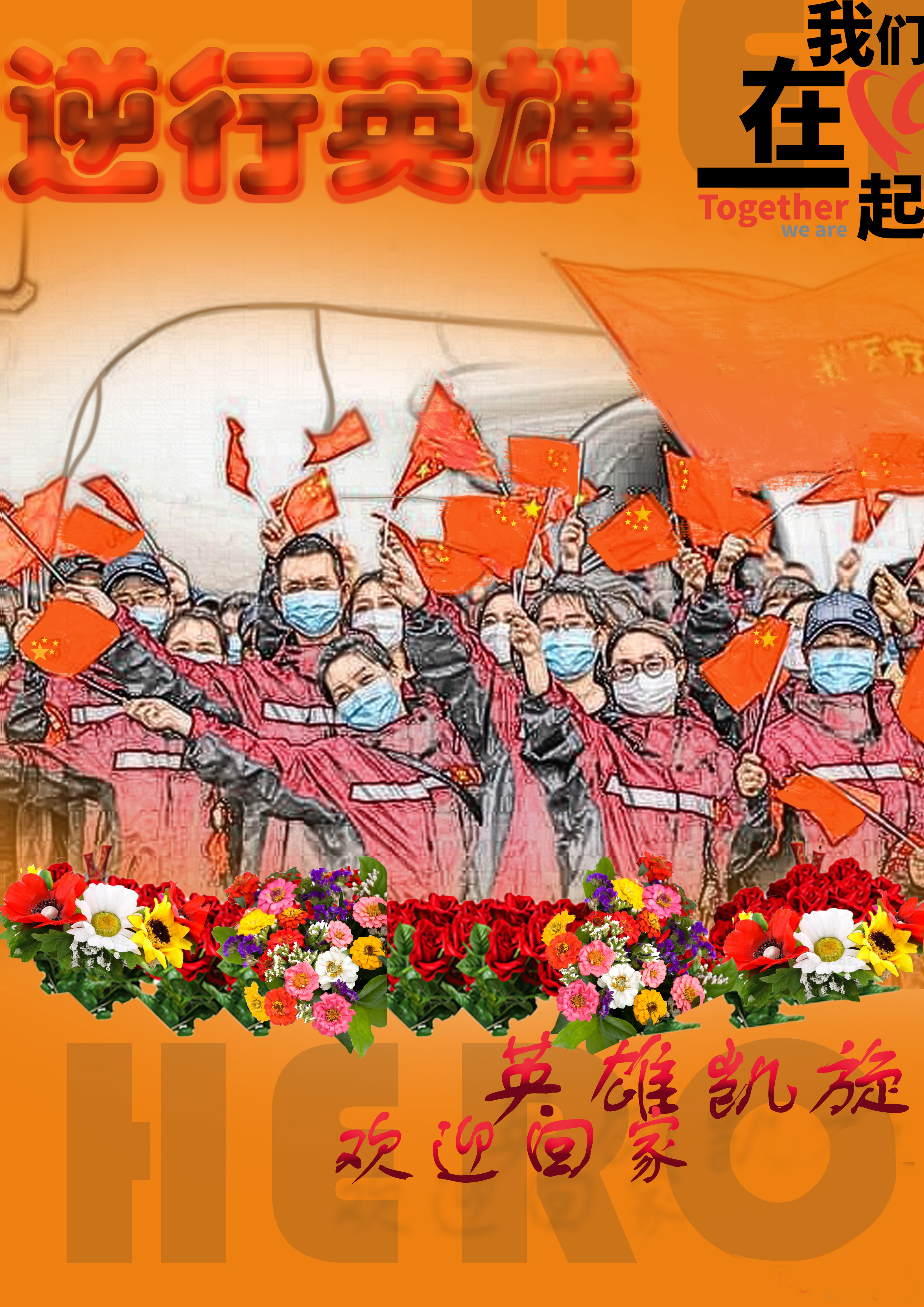 创意说明:鲜花拥簇这我们的英雄,致以最高的崇敬。用生命在前线抗击病毒的他们值得拥有这般崇敬。(作者:唐梓宣)