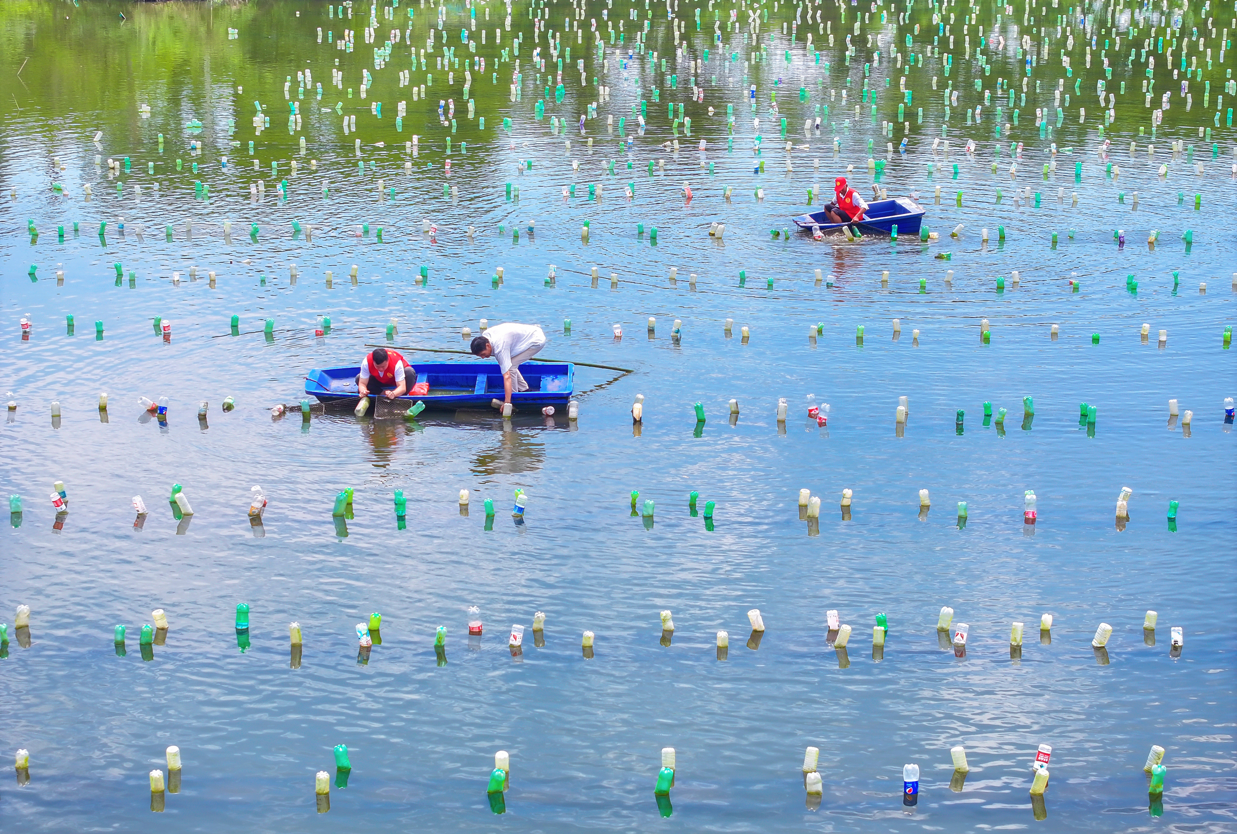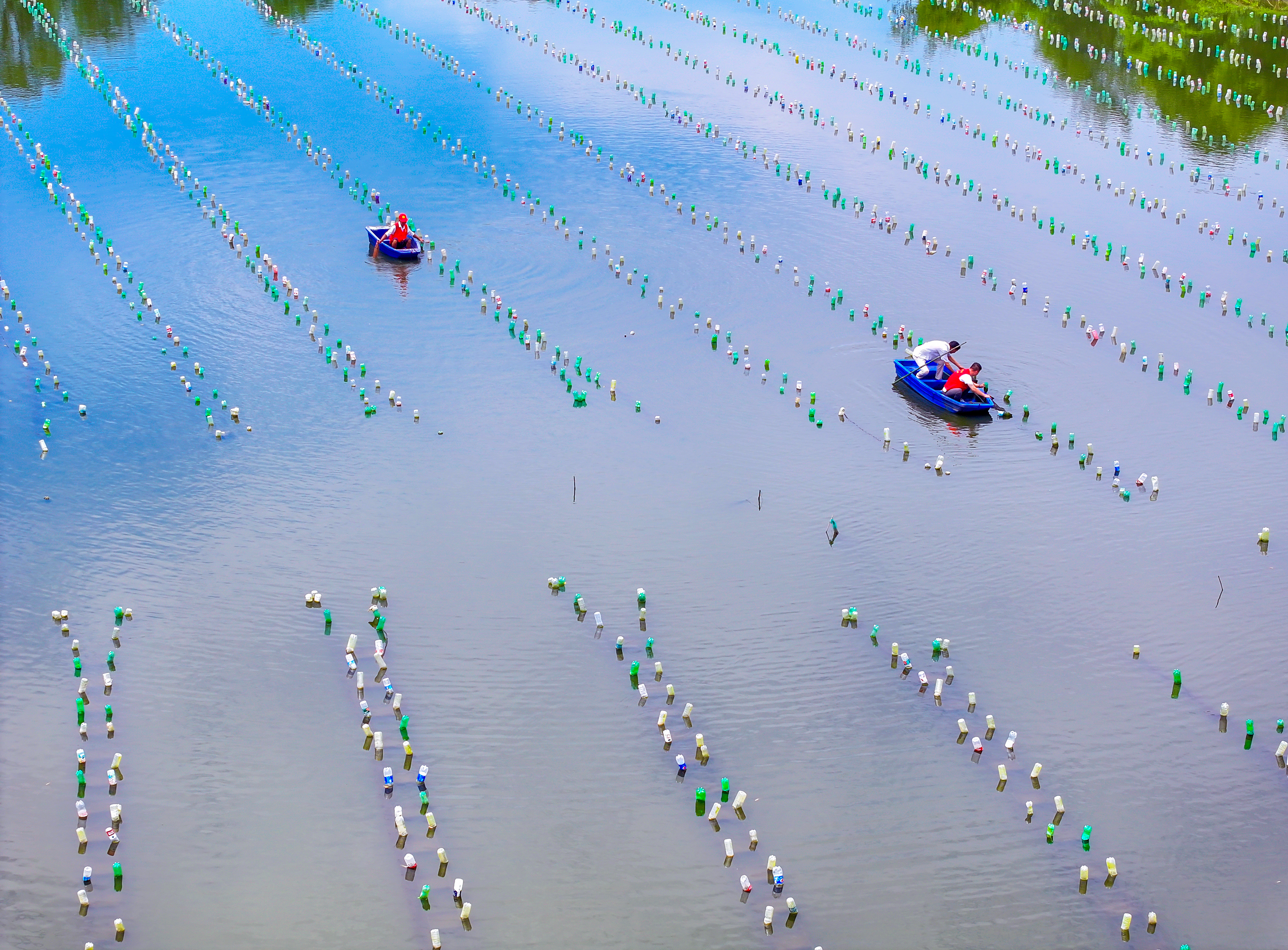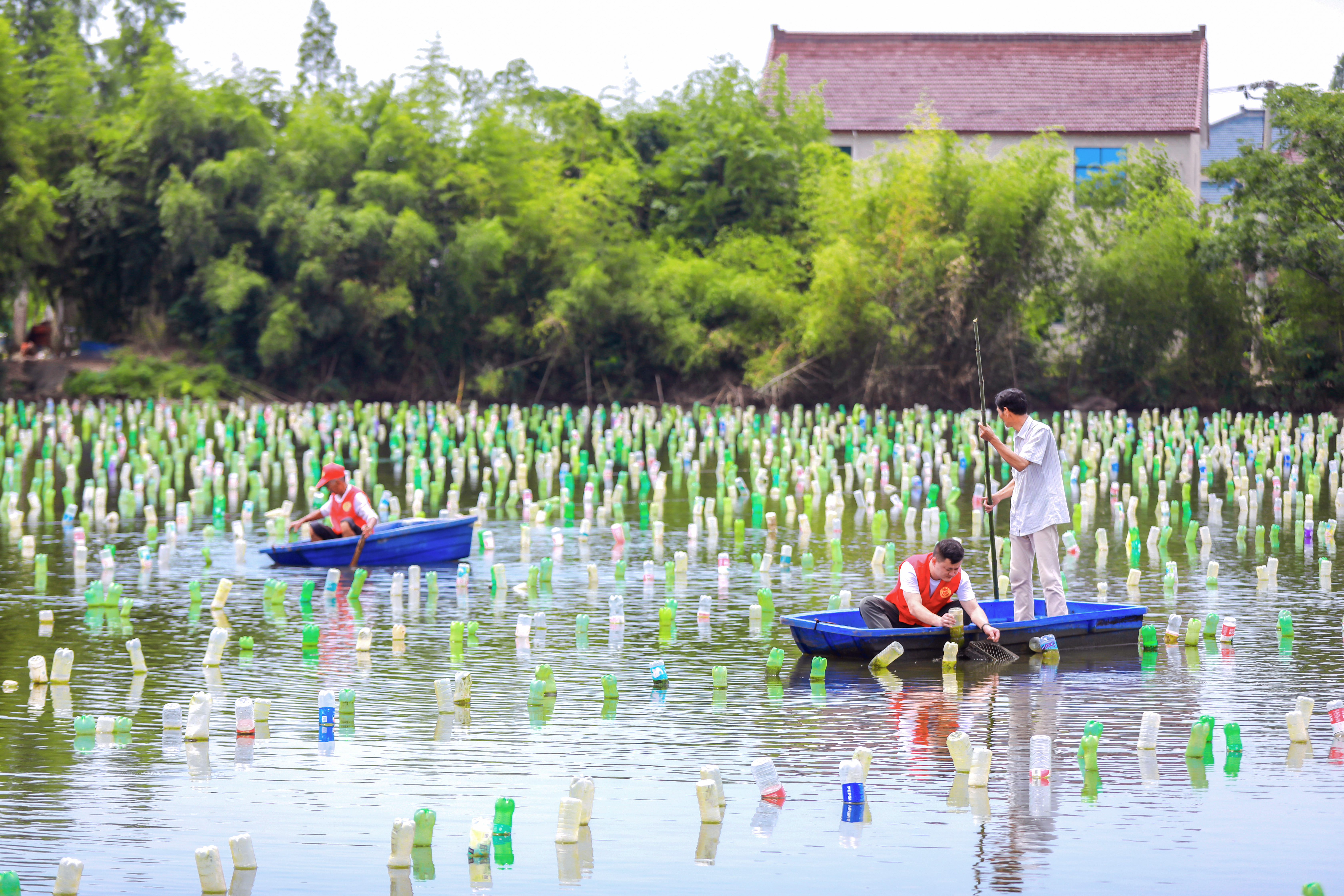 浙江省湖州市长兴县虹星桥镇周村村珍珠蚌生态养殖基地,青年党员志愿者联合退伍军人帮助农民正在水面上对珍珠蚌进行管护,确保丰产丰收。